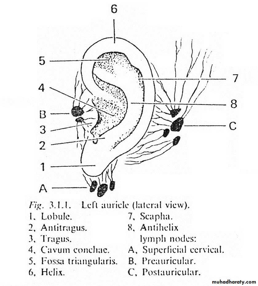 1- The Auricle has a framework of elastic fibrocartilage which is absent in the lobule and in the area between the crus of helix and the tragus. The lobule is formed by fat and fibroareolar tissue. The auricle has two surfaces, lateral and medial surfaces. Parts of the lateral surfaces are as follows:The curved rim is the helix. Anterior to and parallel with the helix is another prominence, the antihelix. Superiorly, this divides into two crura between which is the triangular fossa. The scaphoid fossa lies above the superior of the two crura. In front of the antihelix is the concha. Below the crura of the helix and opposite the concha, across the external auditory meatus is the tragus which is small triangular prominence. Opposite the tragus is the antitragus which is separated from the tragus by intertragic notch. The lobule lies below the antitragus and it is soft composed of fibrous and adipose tissue. The skin of auricle is thin and closely adherent to the perichondrium on the lateral surface.