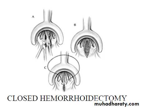Both involve ligation and excision of the haemorrhoid, but in the open technique the anal mucosa and skin are left open to heal by secondary intention, and in the closed technique, the wound is sutured.