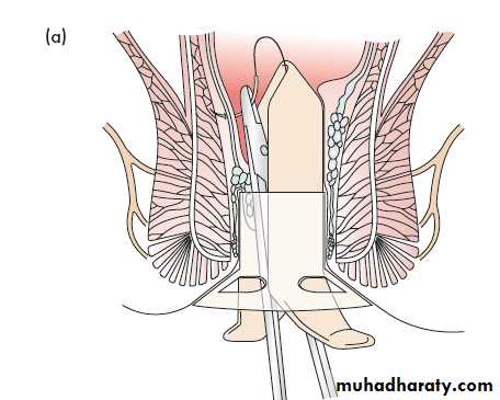 Indication for first and second degree piles, the idea is to inject sclerosing agent at the submucosa at the pedicle of the piles, this lead to fibrosis.