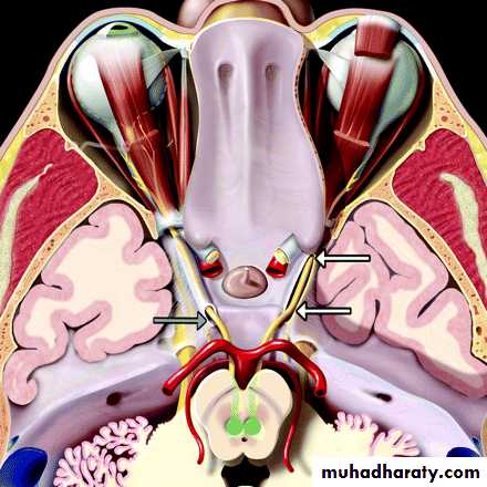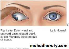 Oculomotor nerve palsyThe nuclear complex of the third (IIIrd) nerve lies in midbrain After leaving the brainstem, the nerve enters subarachnoid space and courses forward and laterally between posterior cerebral artery and superior cerebellar artery. At this level the nerve is compressed by Berry Aneurysms then the artery pass through cavernous sinus, together with trochelear 4th ,abducent 6th ,first division (opthalmic ) and second division (maxillary ) of the 5th cranial nerve ,after that through superior orbital fissure to supplly somatic: Superior rectus (SR), inferior rectus (IR), inferior oblique (IO), medial rectus (MR).