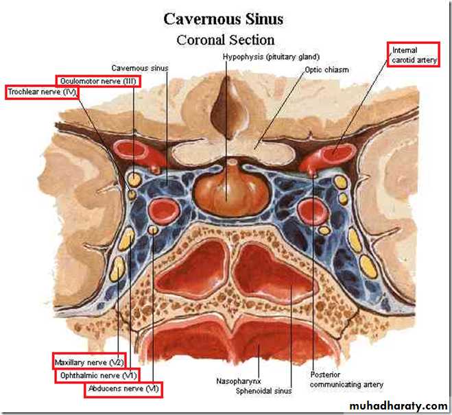 The cavernous sinuses are paired, venous structures located on either side of the sella turcica, They receive venous tributaries from the superior and inferior orbital veins, The cavernous sinus contains the carotid artery, its sympathetic plexus, and the oculomovement nerves (third, fourth, and sixth cranial nerves). In addition, the ophthalmic branch and the maxillary branch of the fifth nerve traverse the cavernous sinus.Clinical manifestation : ophthalmoplegia, chemosis, sometimes proptosis, trigeminal sensory loss in opthalmic and maxillary branches .