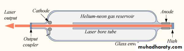 The energy or pump source of the laser is provided by a high voltage electrical discharge passed through the gas between electrodes (anode and cathode) within the tube(figure 7). A DC current of 3 to 20 mA is typically required for CW operation. The optical cavity of the laser usually consists of two concave mirrors or one plane and one concave mirror, one having very high (typically 99.9%) reflectance and the output coupler mirror allowing approximately 1% transmission.High and Low Level Lasers