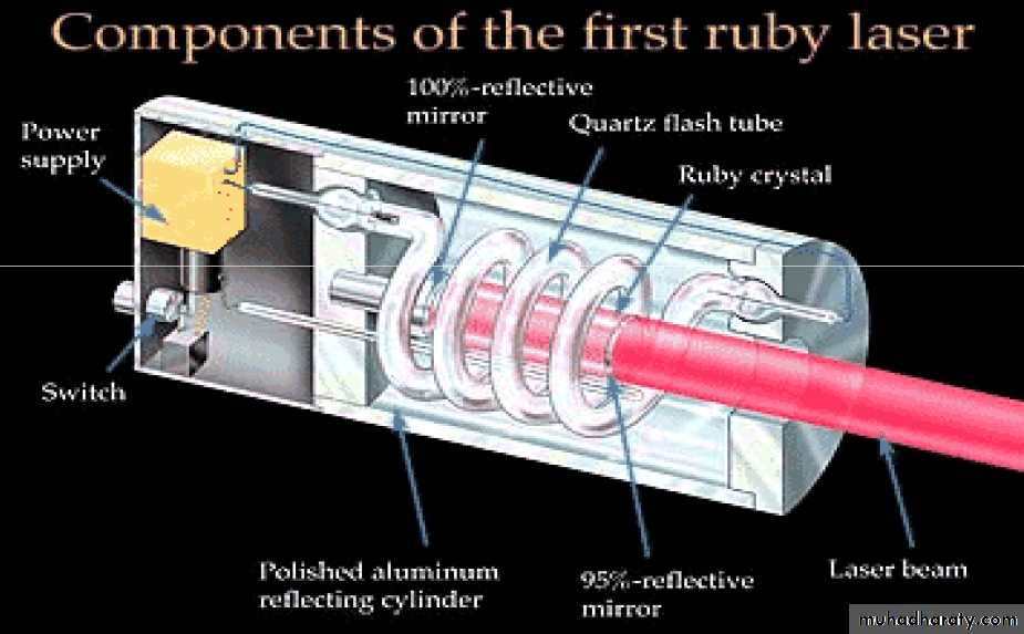 Gain Medium: crystal of aluminum oxide (Al2O3) with small part of atoms of aluminum is replaced with Cr3+ ions. Pump source: flash lamp and the ends of ruby rod serve as laser mirrors(figure6) .
