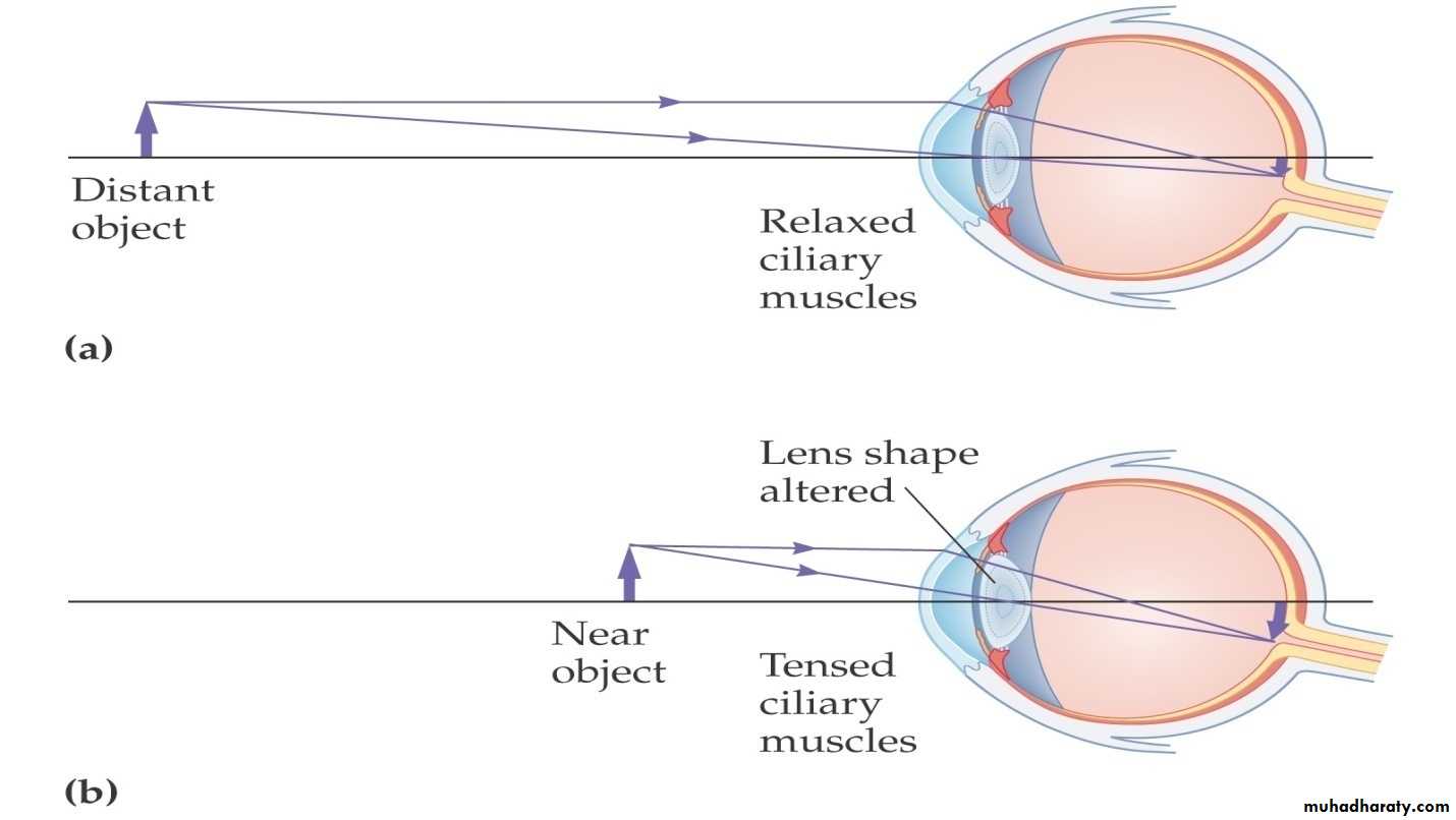 The ciliary muscles adjust the shape of the lens to accommodate near and far vision.