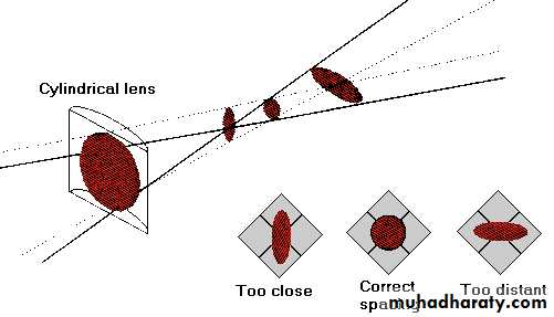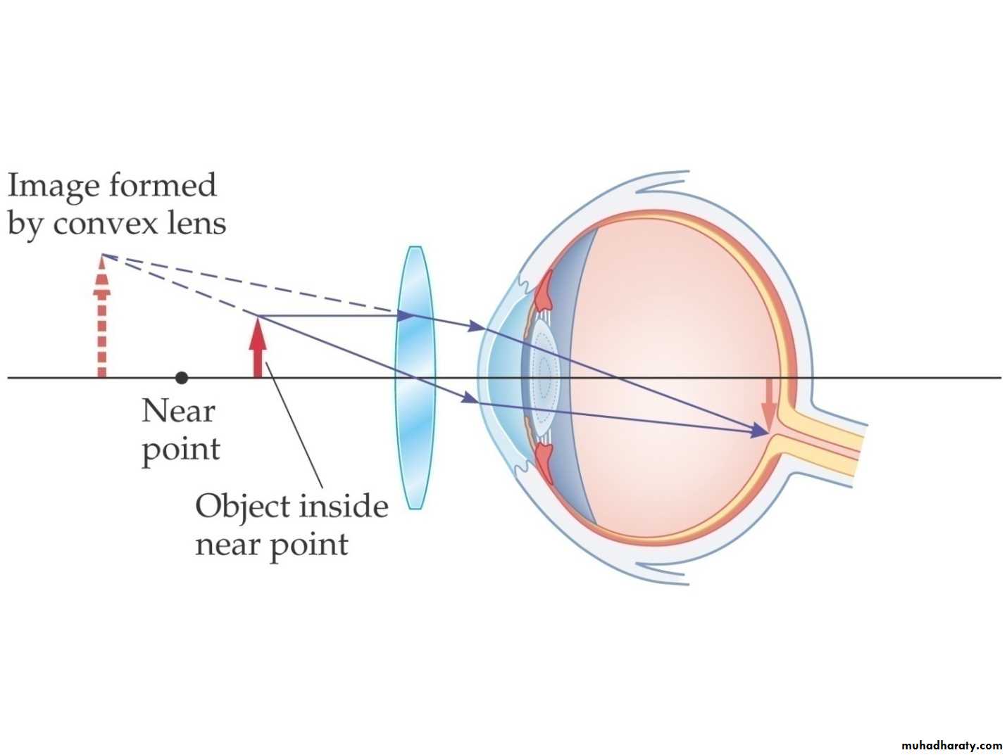 PRESBYOPIA( old sight): As people get older the cillary muscles weaken and lens losses some of its elasticity. The power of accommodation diminishes with age. This defect is corrected by two parts of lenses upper half of each lens is diverging and corrects the myopia when the wears is looking ahead at distance objects, the lower half corrects the presbyopia with a suitable converging lens, and the wearer looks through this part when reading When astigmatism is present, point objects do not form point images on the retina. This is normally due to the corneas unequal curvature in different directions. If the curvature is greater in a horizontal section than in the vertical section, rays brought to afocus more quickly in the horizontal than in the vertical plane. The defect is corrected by the use of cylindrical spectacle lenses .