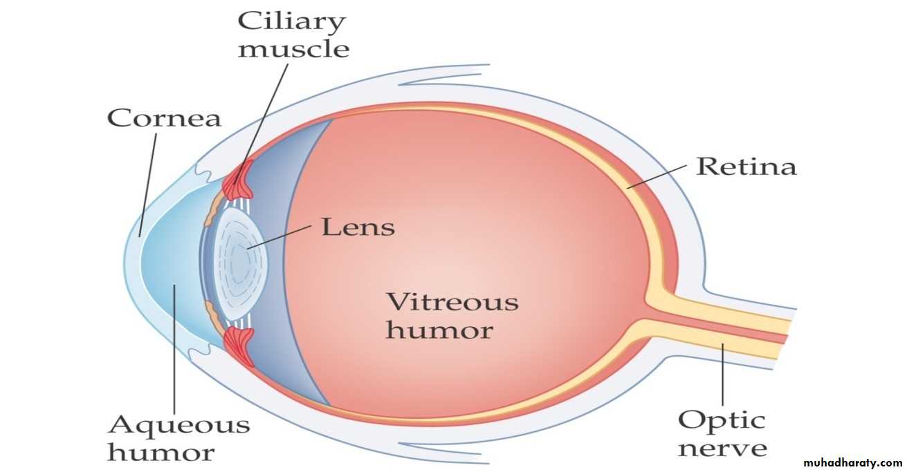 Eye and vision: Light passes through the cornea of the human eye and is focused by the lens on the retina. The ciliary muscles change the shape of the lens, so it can focus at different distances. The vitreous and aqueous humors are transparent. Rods and cones on the retina convert the light into electrical impulses, which travel down the optic nerve to the brain.