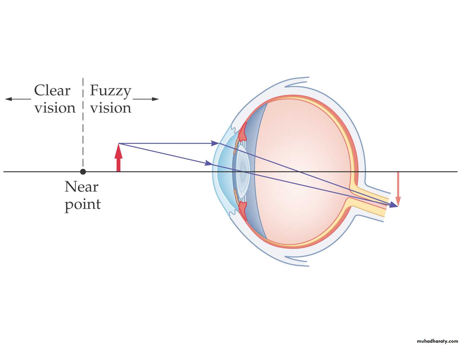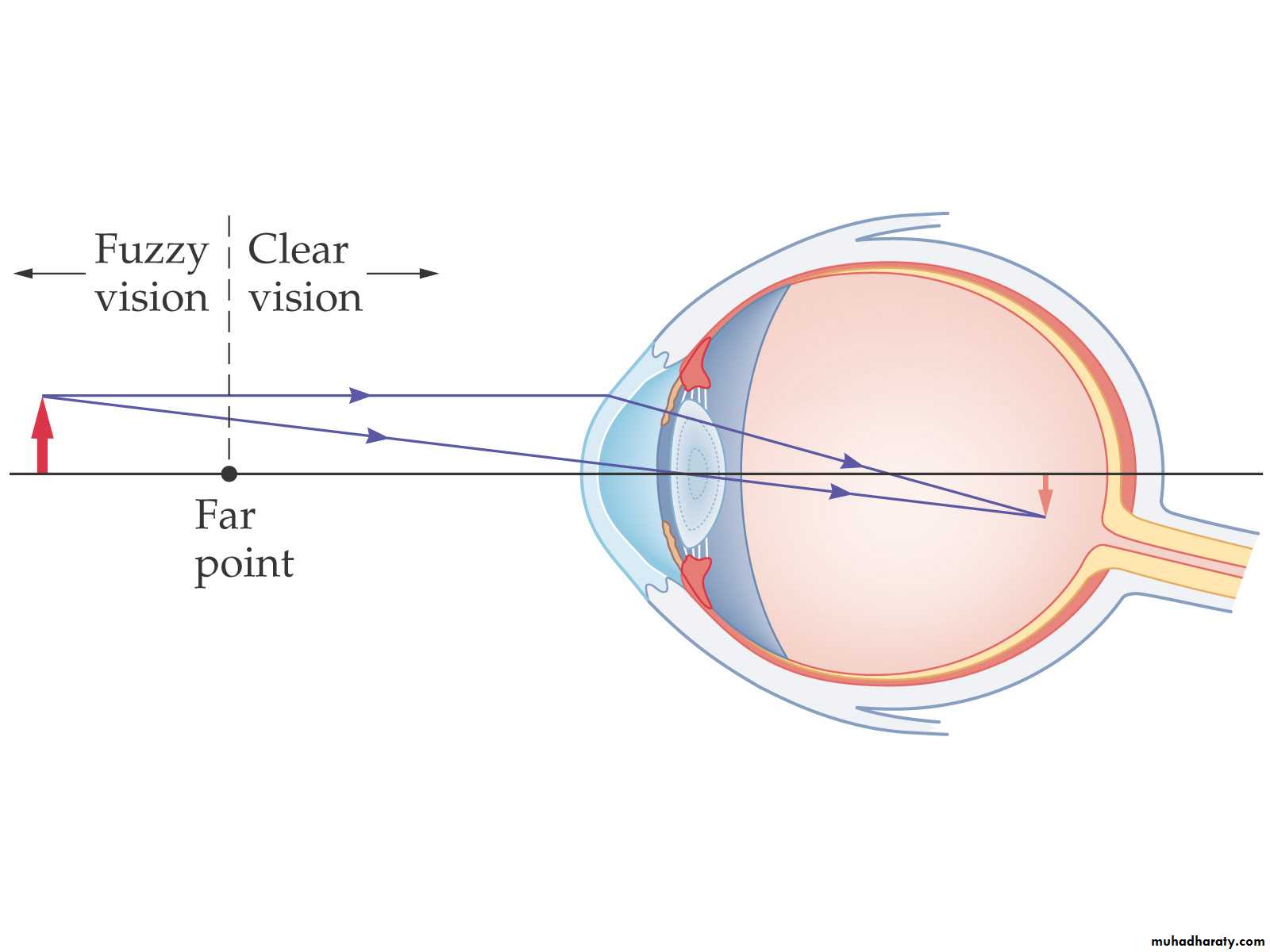 A person who is farsighted can see distant objects clearly, but cannot focus on close objects – the near point is too far away. The lens of the eye is not strong enough, and the image focus is behind the retina.Hyperemia