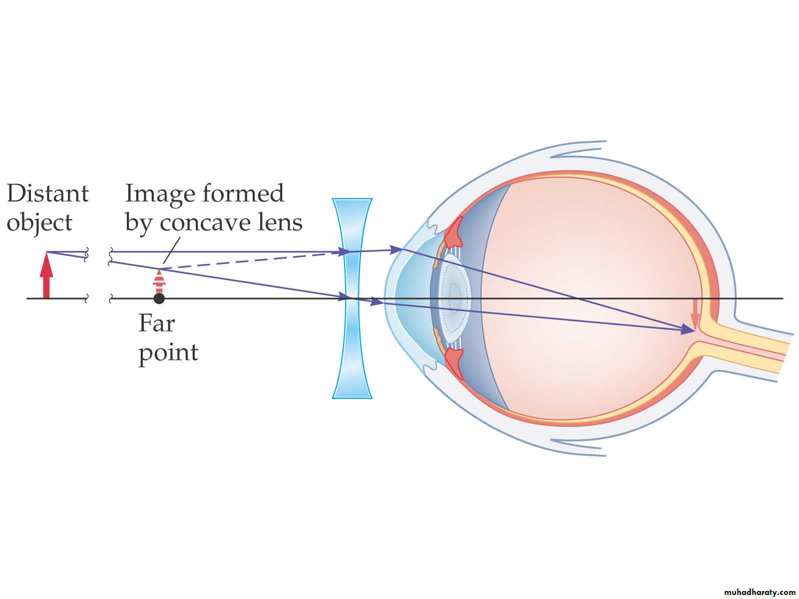 A nearsighted person has a far point that is a finite distance away; objects farther away will appear blurry. This is due to the lens focusing too strongly, so the image is formed in front of the retina.To correct this, a diverging lens is used. Its focal length is such that a distant object forms an image at the far point: