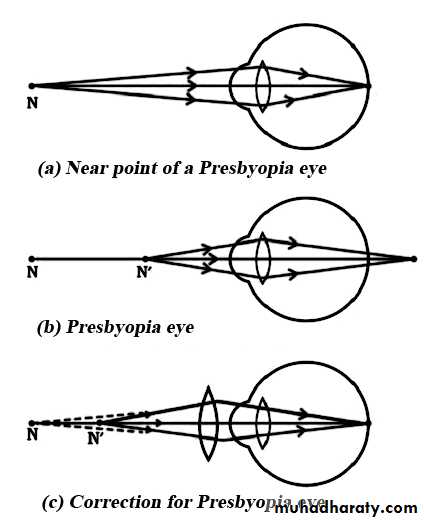 The power of accommodation diminishes with age. This defect is corrected by two parts of lenses upper half of each lens is diverging and corrects the myopia when the wears is looking ahead at distance objects, the lower half corrects the presbyopia with a suitable converging lens, and the wearer looks through this part when readingPRESBYOPIA( old sight)