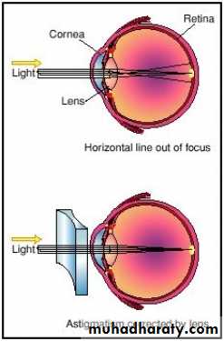 When astigmatism is present, point objects do not form point images on the retina. This is normally due to the corneas unequal curvature in different directions. If the curvature is greater in a horizontal section than in the vertical section, rays brought to a focus more quickly in the horizontal than in the vertical plane. The defect is corrected by the use of cylindrical spectacle lenses