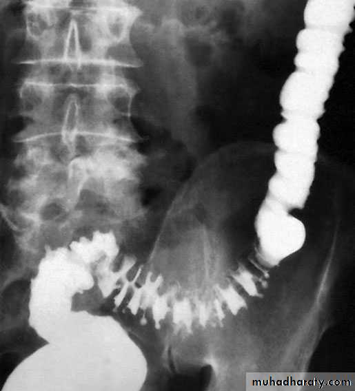 Water-soluble contrast enemas may, however, be helpful in sorting out patients with large bowel obstruction. Barium radiology is carried out to exclude a carcinoma and to assess the extent of the disease. Where the sigmoid colon is thickened and narrowed, a 'saw-tooth’ appearance may be seen.