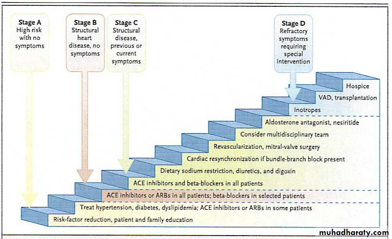 STAGE A: risk factors ,no structural disease or symptoms.STAGE B : structural disease but no symptoms.