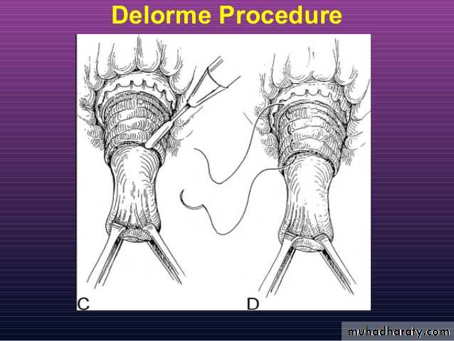 Delorme's operation for rectal prolapse,performed by removal of excessive mucosa and inserting interrupted sutures in the underlying muscle to be plicated.