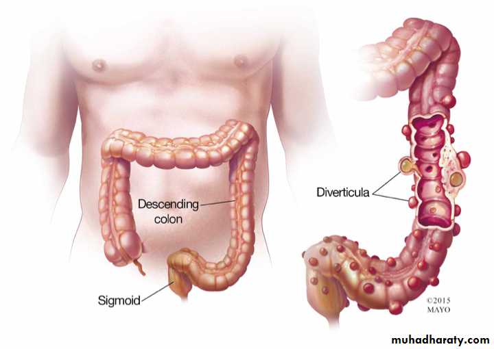 Found around 75% of over seventy year olds in western world.Mostly affect sigmoid colon, but can occur in the caecum or the whole colon ( but not the rectum). Diverticula are most often asymptomatic( diverticulosis) and found incidentally,but can present clinically with sepsis or haemorrhage.