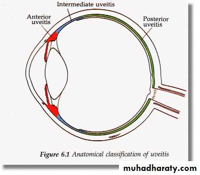 Anterior uveitis: subdivided into iritis & iridocyclitis.