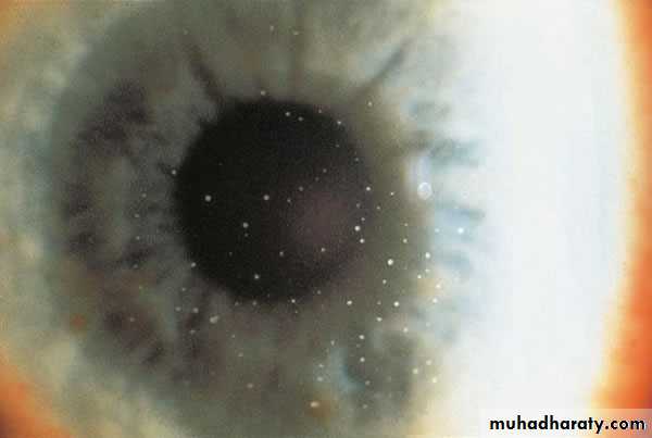 Aqueous flare reflects the presence of protein due to break down of blood aqueous barrier.Endothelial dusting may be myriads of cells is present early and gives rise to a “dirty” appearance and true keratic precipitates usually appears only after a few days and are usually non-granulomatous.