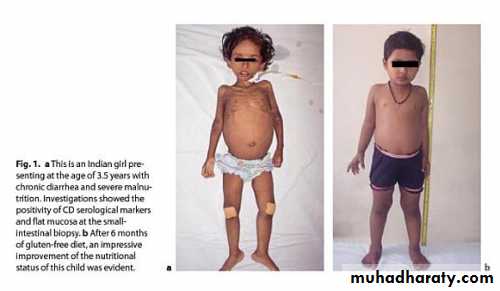 non-specific features such as delayed growth.Features of malnutrition are found on examination and mild abdominal distension.
