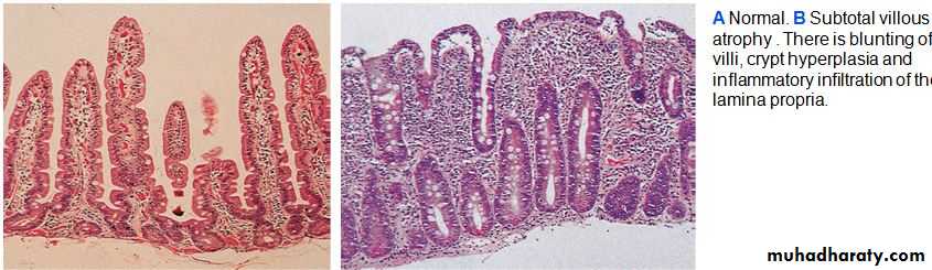 -Almost all patients have partial villous atrophy on duodenal biopsy, identical to that seen in coeliac disease, even though they usually have no gastrointestinal symptoms.
