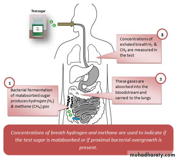 -In bacterial overgrowth, there may be 108–1010/mL organisms, most of which are normally found only in the colon.