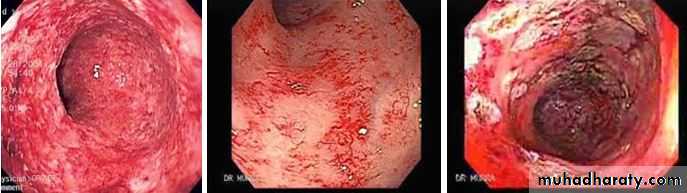 -Acute injury: nausea, vomiting , abdominal pain and diarrhea . When the rectum and colon are involved, rectal mucus, bleeding and tenesmus occur. rectal changes at sigmoidoscopy resemble ulcerative proctitis or ulcerative colitis. Barium follow-through showing small bowel strictures, ulcers and fistulae