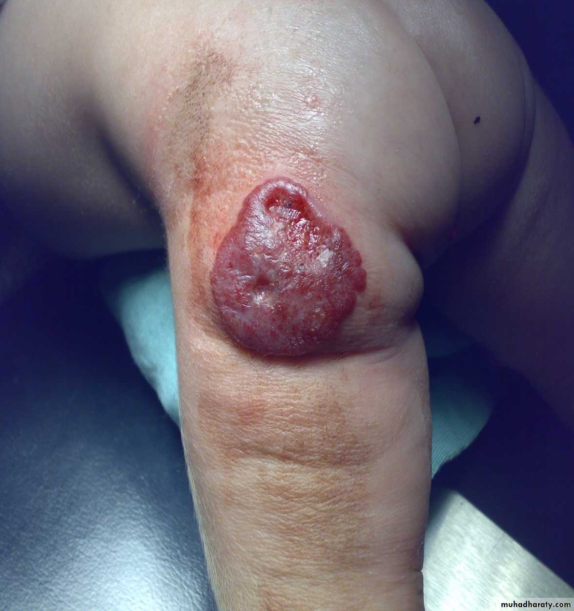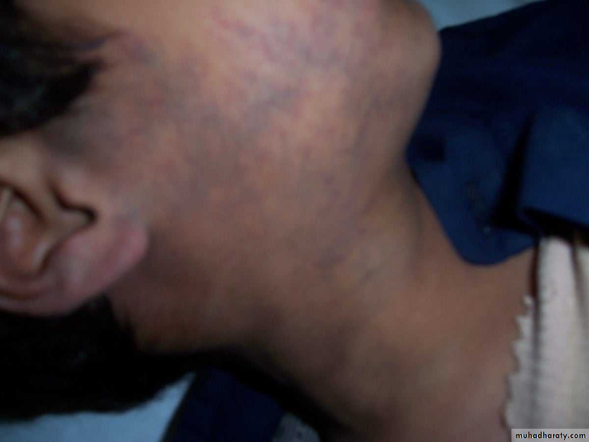 -Microscopically: dilated vascular spaces within dermis and subcutaneous tissue.