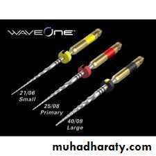 , Wave _One There are 3 Wave One instruments are termed Small (yellow), Primary (red), and Large (black). The Small 21/06 file has a fixed taper of 6% over its active portion. The Primary 25/08 and the large 40/08. This design serves to improve flexibility and conserve remaining dentin in the coronal two-thirds of the finished preparation,