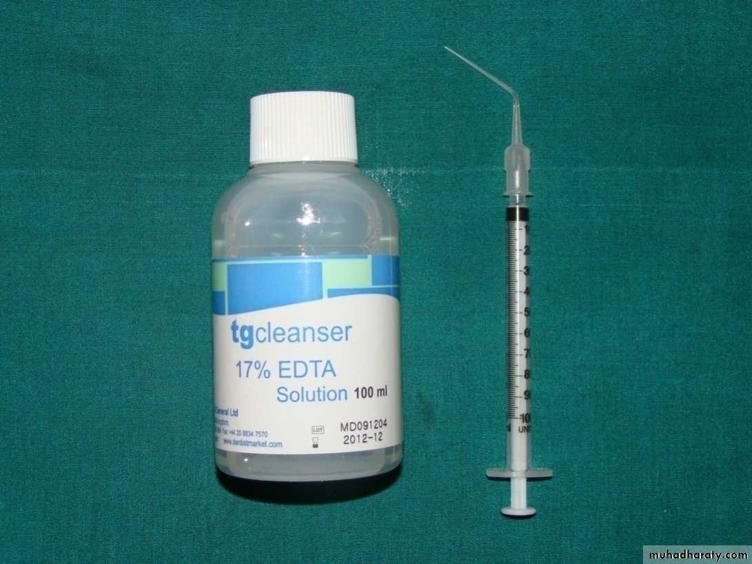 Root canal irrigation was performed at the beginning of the instrumentation and after each instrument size with (2 ml) of 2.5% sodium hypochlorite (NaOCL) solution.At the end of the biomechanical preparation ,the dentinal smear layer was removed from all root canals using (2 ml) of 17% ethylene diamin tetraacetic acid (EDTA) for 1 minute followed by (2 ml) of 5.25% NaOCL solution