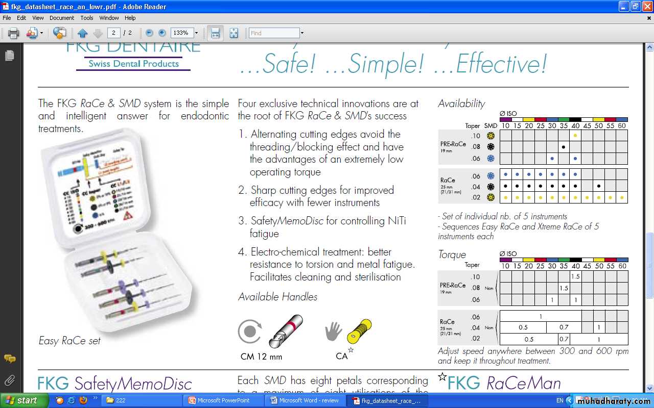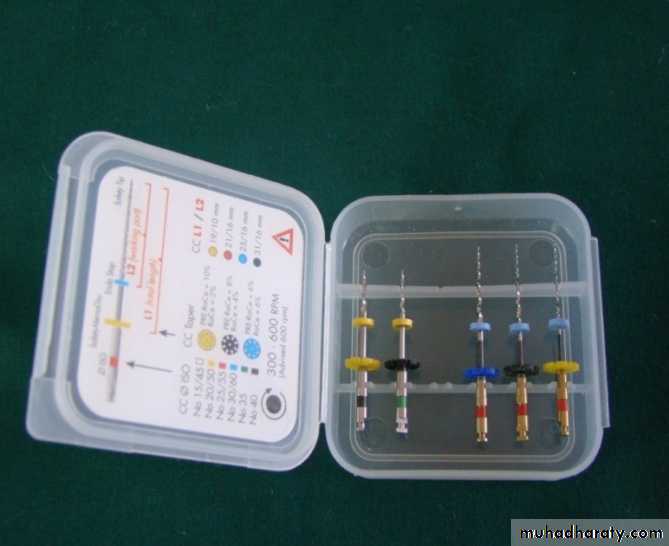 Easy RaCe set consist of Pre-RaCe instrument—0,01/40, 0.08/35 for coronal shaping, and Three 25 mm longe a #25(6%, 4%, 2% taper)for apical finishingThe K3 nickel titanium instruments was introduced in January 2002 in North America by Dr. John McSpadden. six files in sizes 15-60 with three different tapers (2%, 4%and 6%).