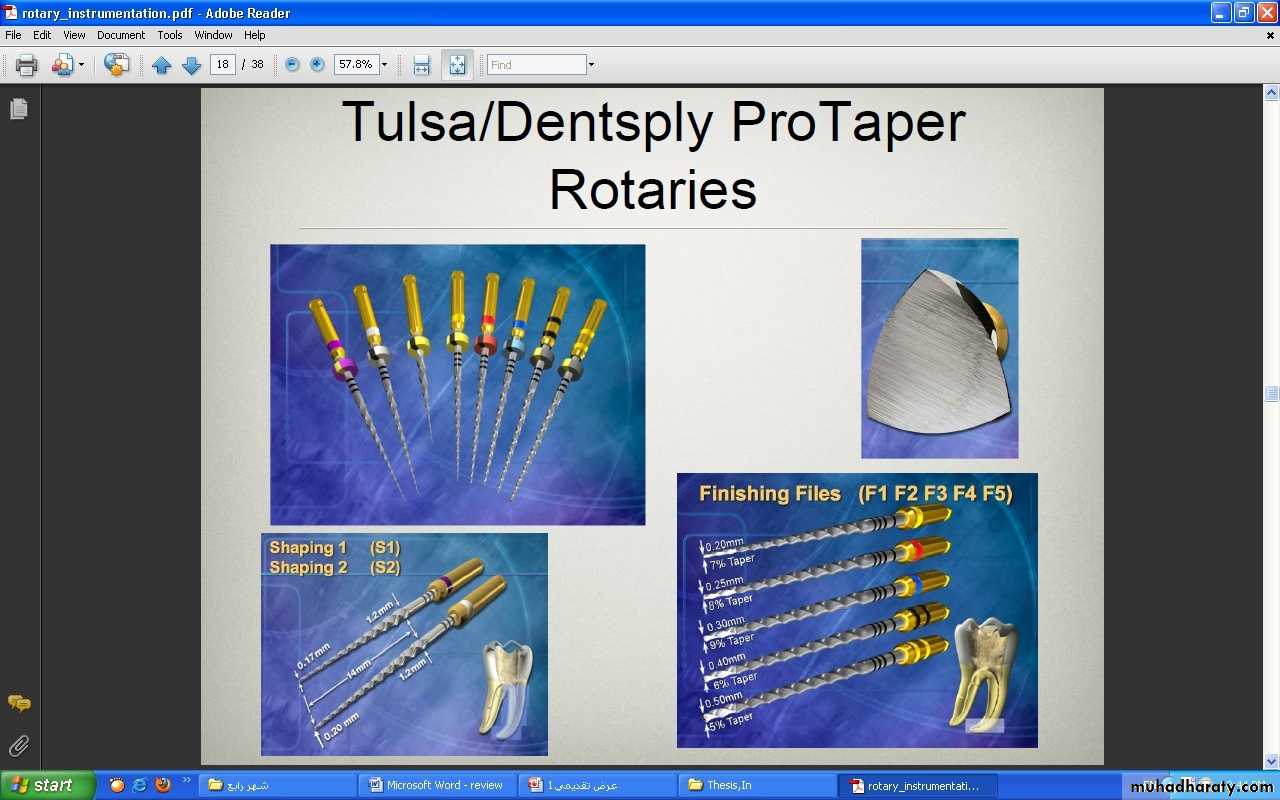 The Protaper rotary nickel titanium were first introduced in 2000,by DENTSPLY Maillefer , it is comprises of 3 shaping files (SX, S1 and S2) and 5 finishers (F1 to F5).