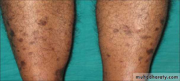 Clinically: Asymptomatic, round, atrophic, hyperpigmented areas on shins (shin spots).