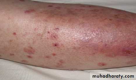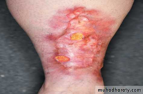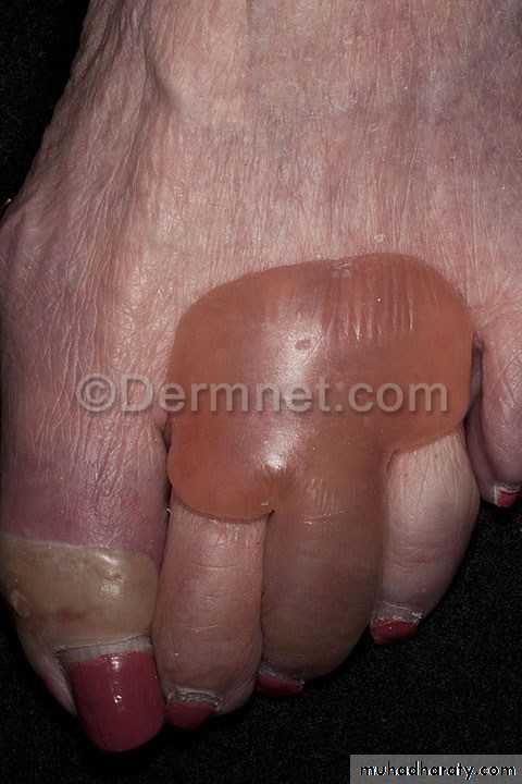 Clinlcaly:Crops of bullae appear abruptly in diabetics, usually on feet and lower legs but may occur on arms.Usually develop overnight without preceding trauma.There is little pain or discomfort.They arise on nonerythematous base and are usually multiple, variable in size, and occasionally huge. They are tense, and spontaneously rupture in 1 week leaving a painless ulcer (that is difficult to heal) with firmly adherent crust.Recurrences may occur.