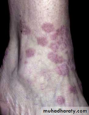 Clinically:The eruption begins as an oval, violaceous patch that expands slowly. The advancing border is red, and the central area turns yellow-brown then atrophies and exhibits a waxy surface; telangiectasias are present. Ulceration occurs, particularly following trauma.