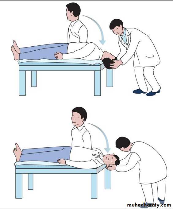 This test is particularly useful when patient complains of vertigo in certain head positions. It also helps to differentiate a peripheral from a central lesion.Figure 6.1 Dix-Hallpike manoeuvre.