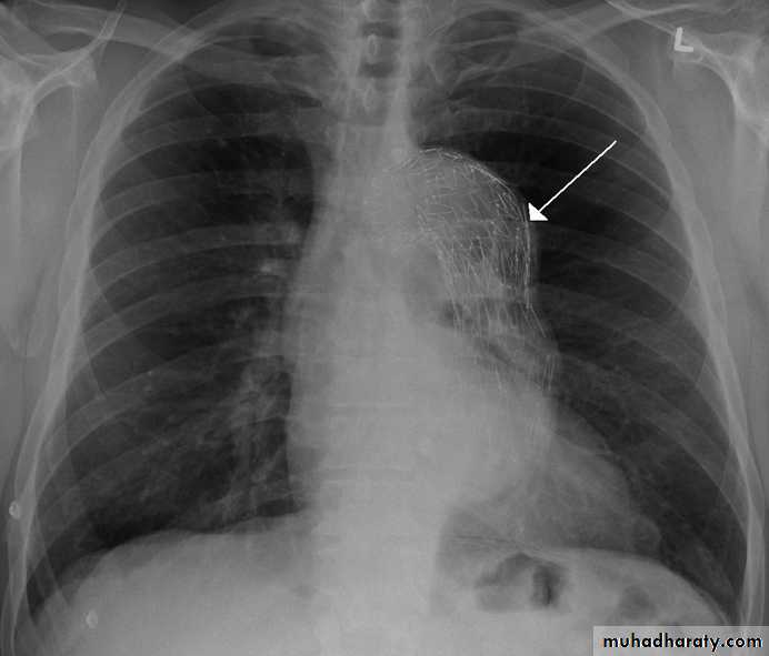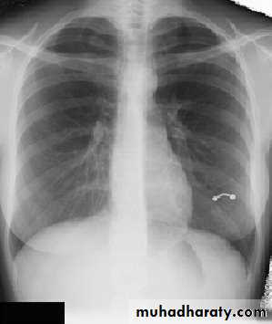 PA chest X-ray: A smooth-contoured cavity of 5 cm diameter, containing gas fluid level, is visible behind the heart shadow (arrow). This lesion is the gas-containing fornix protruding into the chest cavity through the esophageal hiatus.