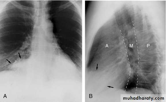 Pericardial fat pad. A, A soft tissue mass (arrows) is seen in the right cardiophrenic angle on the frontal chest x-ray. B, It also is seen in the anterior mediastinum on the lateral view. On this view, the anterior (A), middle (M), and posterior (P) portions of the mediastinum have been identified.