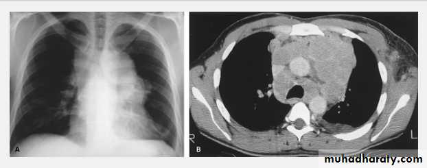 Hodgkin Lymphoma. A. Posteroanterior chest radiograph in a 35-year-old man shows a large, lobulated mediastinal mass. B. Contrast-enhanced CT at the level of the aortic arch shows bulky anterior and middle mediastinal lymphadenopathy