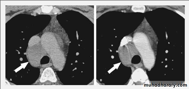 Bronchogenic Cyst. Unenhanced (A) and enhanced (B) CT scans in a 38-year-old man demonstrate a smooth, low-attenuation paratracheal mass (arrows) that fails to enhance, consistent with a bronchogenic cyst.