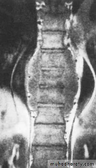 (B) Coronal MR image of the thoracic spine demonstrates destruction of the intervertebral disc at the point where the paraspinal widening is maximal and this change is associated with alteration of signal from the vertebrae.