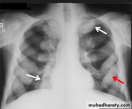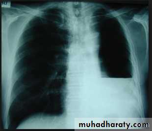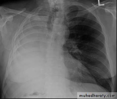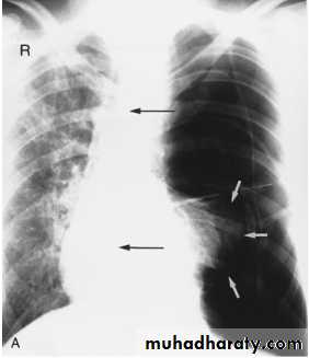 On a posteroanterior chest x-ray (A), the left hemithorax is very dark or lucent because the left lung has collapsed completely (white arrows).