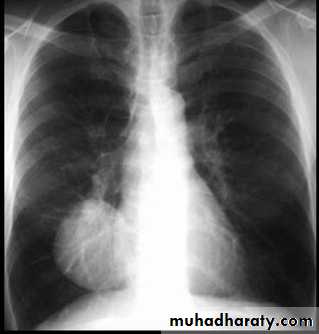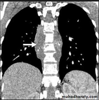 Posteroanterior radiograph in a 15-year-old woman reveals an oval, vertically oriented, right-sided mediastinal mass (arrows).
