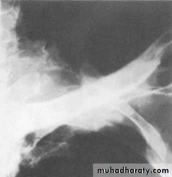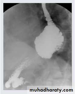 A barium swallow study demonstrates a large hiatal hernia with the majority of the stomach in the chest, not in the abdomen where it belongs.