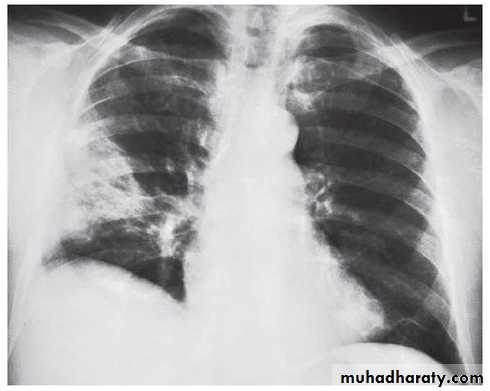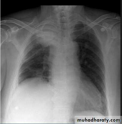 When fluid and air are present in the pleural space on an upright chest x-ray, a perfectly straight horizontal line will extend all the way from the spine to the edge of the pleural cavity. In this patient, a loculated right basilar hydropneumothorax is present.
