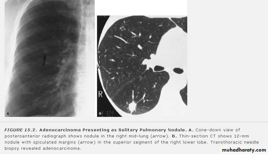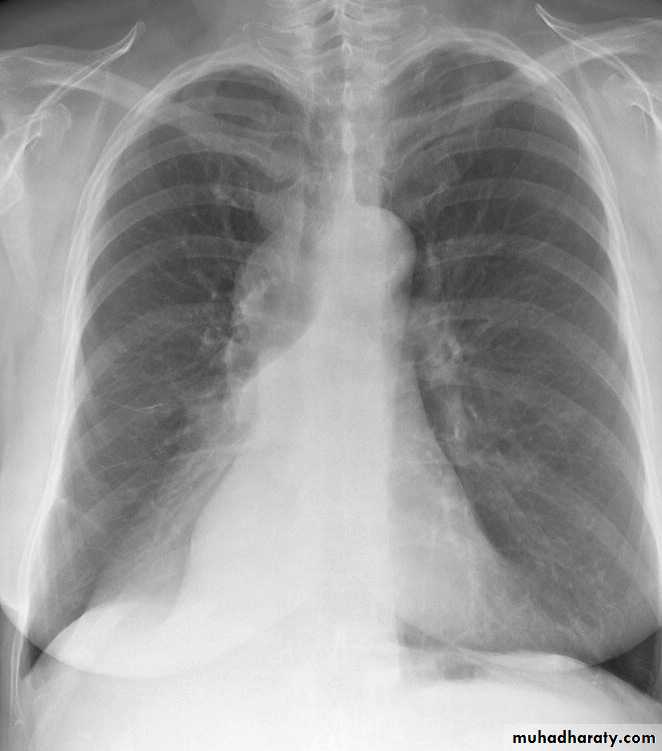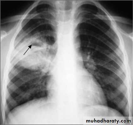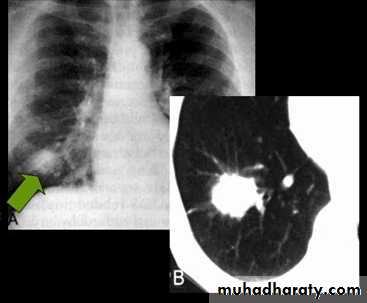 Chest X-ray shows radio-opaque (white) nodular lesion in the right mid-lung field.
