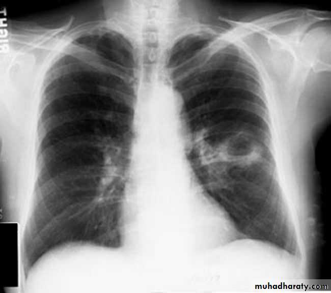 A PA chest radiograph demonstrates a thick-walled cavity with fliud level adjacent to heterogeneous opacities in the left upper lobe.