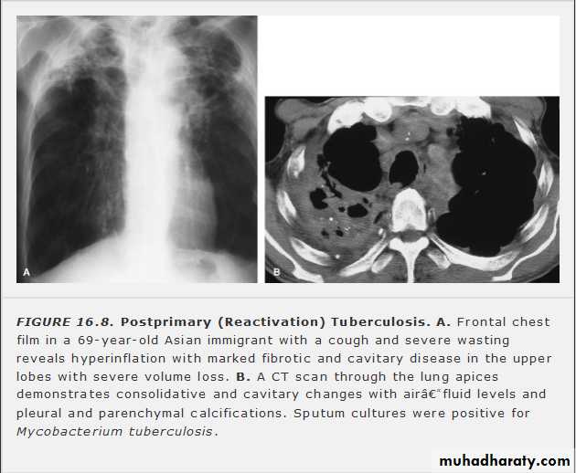 Transbronchial biopsy demonstrated caseating granulomas containing acid-fast bacilli.