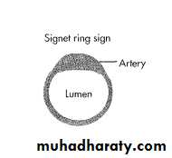 Signet ring sign : focally thickened bronchial wall adjacent to pulmonary artery branch .