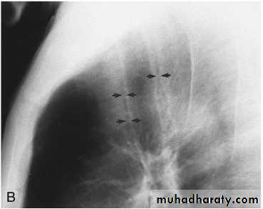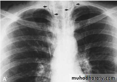 Vertical dark (lucent) lines representing air within the mediastinum are usually seen at or above the level of the aortic arch.
