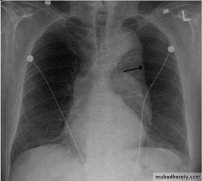 The tension pneumothorax can be identified because the mediastinal contents, including the heart, are shifted toward the right, and the left hemidiaphragm is flattened and depressed. A computed tomography scan done on a different patient with a tension pneumothorax (B) shows a completely collapsed right lung (arrows) and shift of the mediastinal contents to the left.