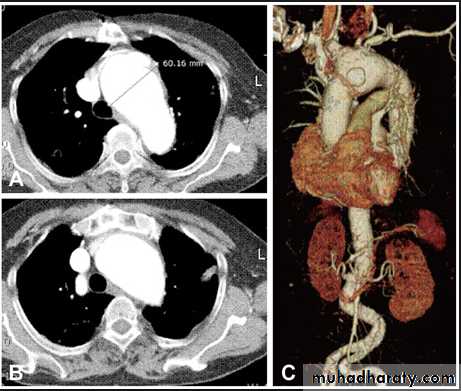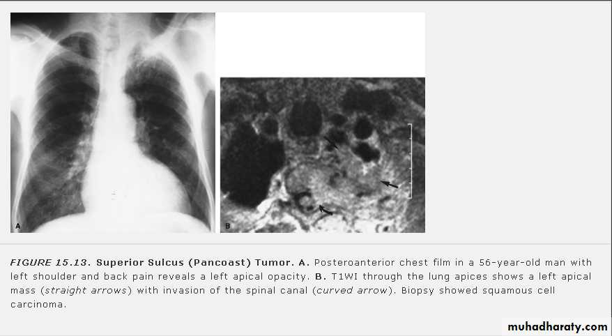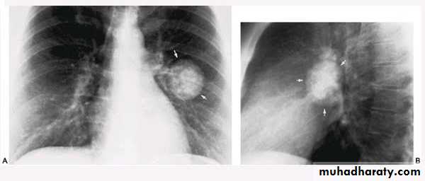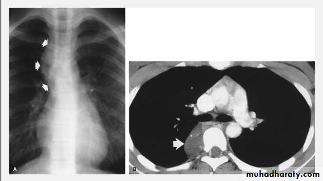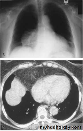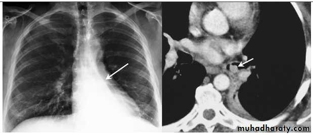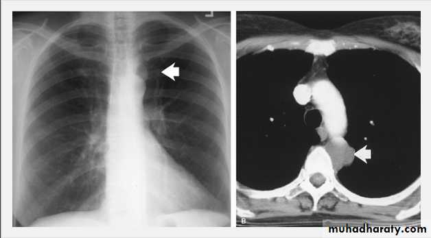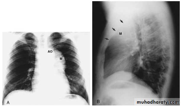 A chest x-ray (A) reveals an unusual contour over the left hilum (arrows). That the hilum is not obscured (no silhouette sign) indicates that the mass must either be in front of or behind the hilum. A computed tomography scan (B) reveals a soft tissue mass (arrow) just to the left of the aorta. This is the most common location of a thymoma.Mediastinal teratoma. A chest x-ray (A) shows a large upper right mediastinal mass (arrows), but no specific internal structure is apparent. A computed tomography scan (B) reveals that the mass contains multiple types of tissue elements including fat (dark), soft tissue (gray), and calcium (white). This is essentially diagnostic of a teratoma.