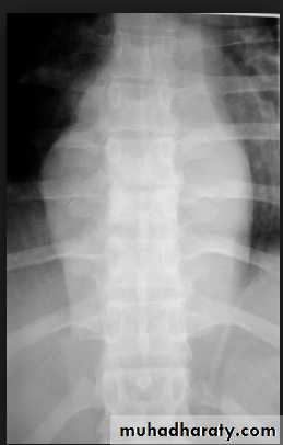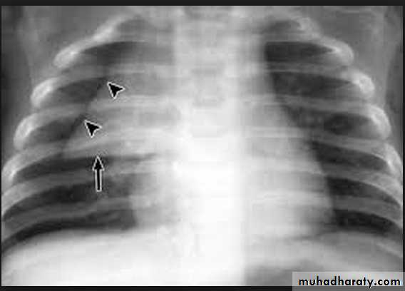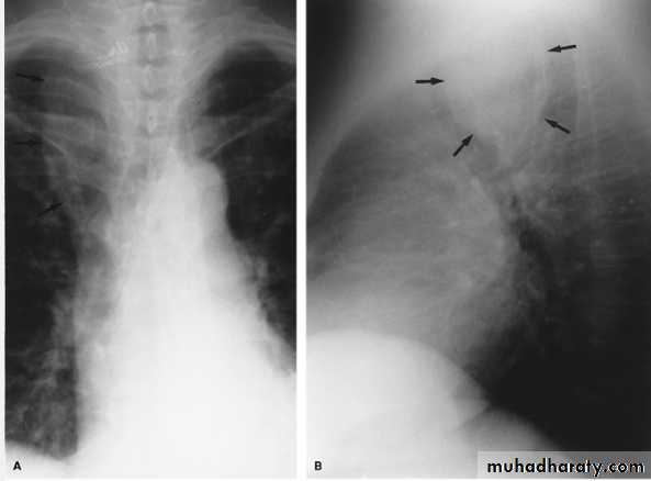 Vertical dark (lucent) lines representing air within the mediastinum are usually seen at or above the level of the aortic arch.On the posteroanterior view (A), these can be seen extending up into the lower cervical soft tissues (arrows).